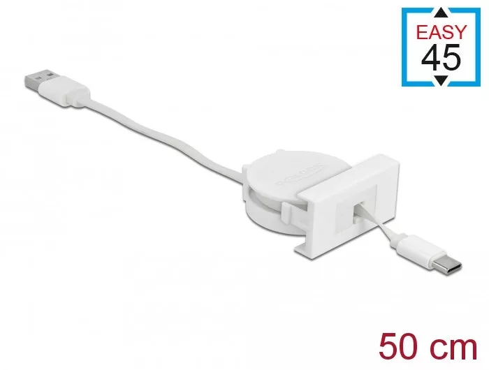 Ez a Delock Easy 45 visszahúzható kábel csatlakoztatható egy személyi számítógéphez, laptophoz vagy tápforráshoz A-typusú USB csatlakoztatójával, és használható adatátvitelre vagy különböző eszközök töltésére USB Type-C csatlakozó felületén keresztül. Az egyszerű csatlakoztatási mechanizmus biztosítja, hogy a modul megfelelő helyzetbe kerül és könnyen ki is húzható, amennyiben szükséges. Flexibilis A USB 2.0 kábel kihúzható hat lépésben, és így szükség szerint különböző hosszúságú lehet. Amennyiben a kábel nem szükséges, az felcsavarodik és tárolásra kerül. Easy 45 kapcsolatok A Easy 45 egy változtatható moduláris rendszer mely lehetővé teszi az összetevők űgy mint csatlakoztatók, HDMI vagy USB kapcsolatok igény szerinti hozzáadását. A Easy 45 modulok standardizáltak és beépíthetők különböző modultartókba vagy kábelcsatornákba. A Easy 45 kapcsolódási felületet biztosít elektromos, hálózati és rendszer beépítések, valamint számos perifériás eszköz, úgy mint TV, monitor, nyomtató, laptop stb. között. Műszaki adatok Csatlakozó: 1 x USB 2.0 A-típusú dugó 1 x USB Type-C dugó Kábel vastagsága: Töltőkábel: 24 AWG adatkábel: 30 AWG Lapos kábel Maximális kimeneti feszültség: 2 A Akár 480 Mbps sebességű adatátvitel Feszültség: max. 5 V Hosszúság a csatlakozóval együtt: USB-A csatlakozó végű kábel kb. 12 cm USB-C eszközkábel kb. 50 cm (kihúzva) Alkalmas Delock Easy 45 modul tartóhoz Alkalmas egy minimum 45 mm mélységű, 45 mm-es kábelcsatornához Modul mérete: 22,5 x 45 mm Méretek (HxSzxM): kb. 45,0 x 22,5 x 47,0 mm Szín: fehér Rendszerkövetelmények Áramforrás egy szabad A-típusú USB porton keresztül PC vagy notebook számítógép szabad USB A-típusú-csatlakozóval USB Type-C -porttal ellátott készülék Egy szabad modul portos Delock Easy 45 A csomag tartalma Easy 45 modul behúzhatós kábel Csomag Zárható műanyag tasak Gyártó: Delock