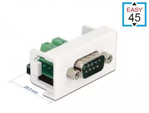 Ezt a Delock Easy 45 modul D-Sub apa port kialakításúnak tervezték. Az egyszerű csatlakoztatási mechanizmus biztosítja, hogy a modul megfelelő helyzetbe kerül és könnyen ki is húzható, amennyiben szükséges. Easy 45 kapcsolatok A Easy 45 egy változtatható moduláris rendszer mely lehetővé teszi az összetevők űgy mint csatlakoztatók, HDMI vagy USB kapcsolatok igény szerinti hozzáadását. A Easy 45 modulok standardizáltak és beépíthetők különböző modultartókba vagy kábelcsatornákba. A Easy 45 kapcsolódási felületet biztosít elektromos, hálózati és rendszer beépítések, valamint számos perifériás eszköz, úgy mint TV, monitor, nyomtató, laptop stb. között. Műszaki adatok Csatlakozó: külső: 1 x 9 érintkezős D-Sub dugó belső: 1 x 10 tűs sorkapocs csavaros végződéssel Anyag: PC műanyag Alkalmas Delock Easy 45 modul tartóhoz Alkalmas egy minimum 45 mm mélységű, 45 mm-es kábelcsatornához Modul mérete: 22,5 x 45 mm Méretek (HxSzxM): kb. 22,5 x 45,0 x 32,0 mm Szín: fehér Rendszerkövetelmények Egy szabad modul portos Delock Easy 45 A csomag tartalma Easy 45 modul Csomag Zárható műanyag tasak Gyártó: Delock
