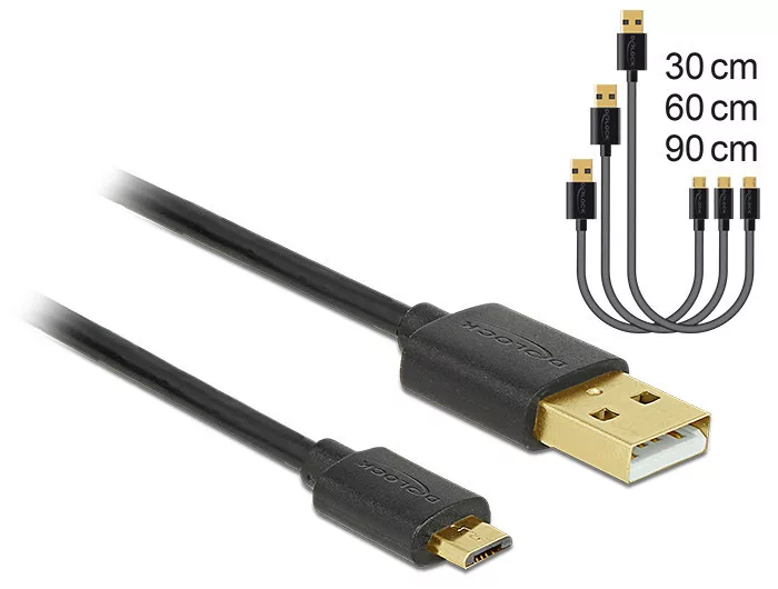 Tulajdonságok:Ezek a Delock USB adat- és töltő kábelek csatlakoztathatók személyi számítógéphez vagy USB típusú A-csatlakozóval rendelkező tápegységhez. Ez gyorssá és könnyűvé teszi a Micro USB csatlakozóval felszerelt mobil eszközök töltését, valamint az adat átvitelt. A nagy átmérőjű kábel lehetővé teszi a gyors töltést egy külső akkumulátorral (Powerbank) vagy modern USB töltőkkel. A készlet 3 különböző kábele minden helyzetben megfelelő hosszúságot biztosít.