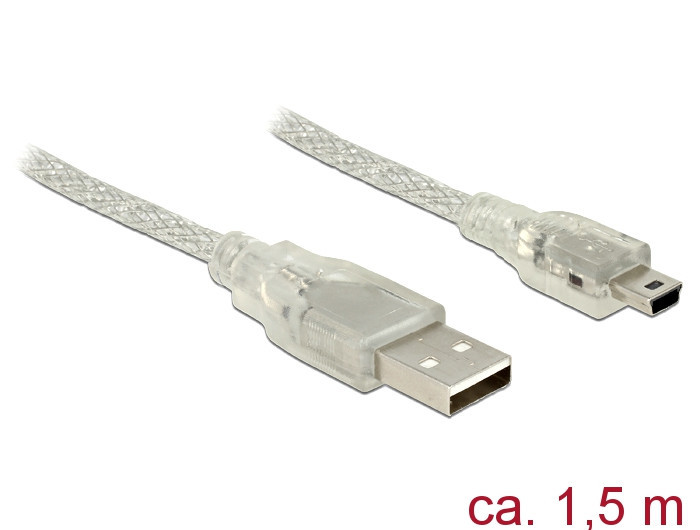 Delock USB 2.0-s kábel A-típusú csatlakozódugóval > USB 2.0 Mini-B csatlakozódugóval, 1,5 m, áttetsz (83906)