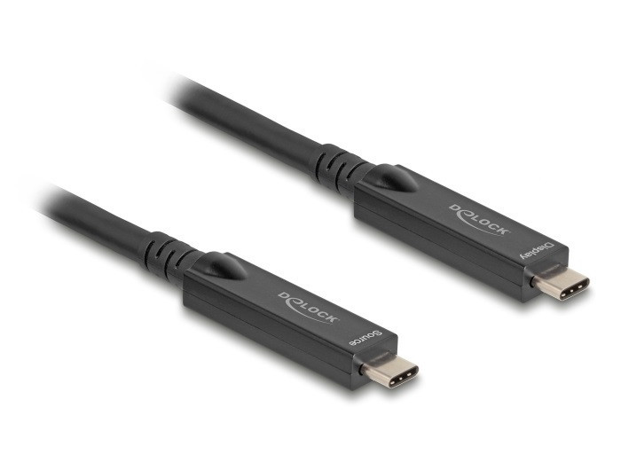 Ez a Delock gyártmányú USB-kábel lehetővé teszi, hogy USB Type-C csatlakozóval ellátott készüléket csatlakoztasson egy szabad USB Type-C -porttal rendelkező számítógéphez vagy laptophoz. Aktív optikai kábel Ez az aktív optikai kábel optikai szálat használ, hogy nagy sebességű jelet szállítson. Hagyományos rézkábelekhez képest ez puhább, vékonyabb, könnyebb és jeltovábbítása nagyobb távolságokat tud áthidalni jelvesztés nélkül. DisplayPort 2.1 4 sávval Ez a kábel alkalmas egy USB-C csatlakoztatójú, akár 8K Ultra HD (7680 x 4320 @ 60 Hz) felbontású képernyő és egy USB-C csatlakozó felülettel rendelkező, DisplayPort Alternate Mode felszerelt számítógép összekötésére. Amikor egy Display Port és USB szimultán működéssel jellemezhető dokkoló állomáshoz kapcsolódik 10 Gbps mértékben, lehetségessé válik egy 3840 x 2160-os, 120 Hz-en megvalósuló felbontás. USB 10 Gbps-mal Az aktív optikai kábel lehetővé teszi az adatátvitel sebességét akár 10 Gb/s-mal, amennyiben egy USB 10 Gbps kompatibilis eszközökkel van összekötve. Természetesen az USB 2.0 eszközök egymással is összekapcsolódhatnak. USB Power Delivery (tápellátó) akár 60 wattal tudja biztosítani a tápellátást A standard USB tápellátás támogatással az összekötött eszközök feltölthetők akár 60 W (20 V / 3 A) egységgel. Megjegyzés Ez a kábel csak DisplayPortos (DP alt mode) eszközökkel kompatibilis és nem fog működni Thunderbolt típusú eszközökkel. Műszaki adatok Csatlakozó: 2 x USB 10 Gbps USB Type-C dugó Aktív optikai kábel: szál / réz hibrid kábel Támogat 2 / 4 sávos DisplayPort 1.4 Támogatja a Display Stream Compression 1.2 (DSC) használatát Támogatja DP Alt módot Hang- és videojelek továbbítása Maximális felbontás (a rendszertől és csatlakoztatott hardvertől függően) DisplayPort 2.1 DSC-vel: akár 7680 x 4320 @ 60 Hz (4 Lanes) DisplayPort 1.4 DSC-vel: akár 3840 x 2160 @ 120 Hz (2 Lanes) Támogatja a HDR (High Dynamic Range) használatát Támogatja a HDCP 1.4 és 2.2 használatát Kötött jelirány videók esetén (Forrás (Source) / Megjelenítés (Display)) Nem kötött irányú adatok számára Akár 10 Gbps sebességű adatátvitel Lefele kompatibilis USB 2.0 Kimeneti feszültség: max. 3 A Kábelborítás anyaga: TPE Kábelátmérő: kb. 6,5 mm Szín: fekete Hosszúság a csatlakozóval együtt: kb. 3 m Rendszerkövetelmények Asztali vagy hordozható számítógép szabad USB Type-C porttal és DisplayPort váltakozó móddal Monitor egy szabad USB Type-C (DP Alt Mode)-csatlakozóval A csomag tartalma USB 10 Gbps kábel Csomag Doboz Gyártó: Delock