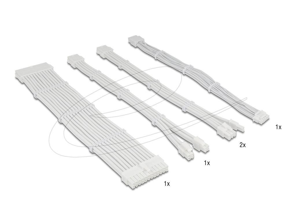 Delock Tápkábel-hosszabbító készlet, 30 cm, 5 darabos, fehér, harisnyázott kivitelben, kábelfésűkkel (1 x 24 tűs ATX, 1 x 12 + 4 tűs 12VHPWR PCIe 5.0, 1 x 4 + 4 tűs EPS, 2 x 6 + 2 tűs PCIe)