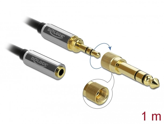 Delock Sztereó hosszabbító kábel 3,5 mm 3 pólusú apa anya, 6,35 mm-es csavaros adapterrel 1 m (85780)