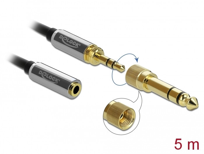 Delock Sztereó hosszabbító kábel 3,5 mm 3 pólusú apa anya, 6,35 mm-es csavaros adapterrel 5 m (85783)