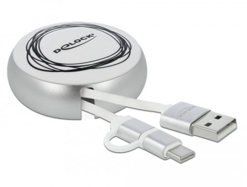 Ez a Delock praktikus, behúzható kábel összekapcsolható egy USB A porttal rendelkező személyi számítógéppel vagy laptoppal és adatátvitelre, valamint a csatlakoztatott eszköz töltésére használható. Hasznos társ Kis méretének köszönhetően a kábel egy praktikus tars útközben és mindig kéznél van. A tekercselési mechanizmus megakadályozza a kábelek összecsomózódásának veszélyét. Flexibilis A kábel öt lépésben húzható ki, így különböző kábelhosszúságokat biztosítva a szükségek alapján. Műszaki adatok Csatlakozó: 1 x USB 2.0 A-típusú dugó > 1 x USB 2.0 Micro-B típusú dugó 1 x USB 2.0 C-típusú dugó Maximális kimeneti feszültség: 2,1 A Feszültség: max. 5 V Kábel vastagsága: 28 AWG adatvezeték 24 AWG tápvezeték Lapos kábel Csatlakozó fémházzal Szín: fehér / ezüst A ház mérete (AxM): kb. 5,6 x 2,3 cm Hosszúság a csatlakozóval együtt: kb. 92 cm (teljes hossz a házzal együtt) USB-A csatlakozó végű kábel kb. 46 cm USB Micro-B + USB Type-C -kábel kb. 46 cm Rendszerkövetelmények PC vagy notebook számítógép szabad USB A-típusú-csatlakozóval A csomag tartalma Kábel Csomag Retail Box Gyártó: Delock