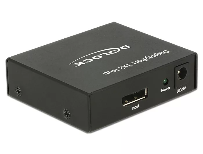 Ez a Delock gyártmányú elosztó DisplayPort-jelet fogad egy asztali vagy hordozható számítógépről, és a jelet két csatlakoztatott kijelzőre osztja el. Ennek köszönhetően két DisplayPort-monitor működtethető egy DisplayPort-csatlakozóval. Mindkét kimenet kettős üzemmódra képes (DP++), így HDMI- vagy DVI-monitorok csatlakoztathatók a megfelelő adapterekkel.