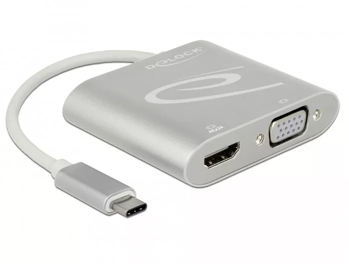 Ez a Delock elosztó alkalmas egy VGA és egy HDMI monitor csatlakoztatására a számítógéphez az USB-C™ csatlakozóval és a DisplayPort alternatív mód támogatásával. A kimeneteken egyszerre két monitort lehet működtetni.