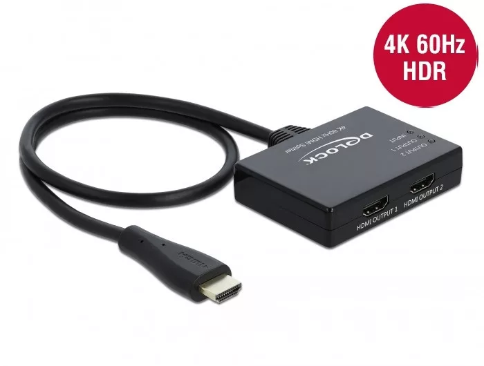 A Delock HDMI Splitter (87747) lehetővé teszi egyetlen HDMI jel forrás (pl. Blu-ray lejátszó, DVD lejátszó, játékkonzol, számítógép stb.) megosztását két különböző HDMI bemeneti eszközre (pl. TV, monitor, projektor). Ezzel a praktikus eszközzel egyszerűen elérhető, hogy több kijelzőn is ugyanazt a tartalmat nézhesse, anélkül, hogy cserélgetnie kellene a kábeleket.