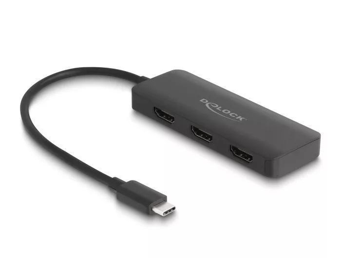 Ez a Delock megosztó alkalmas három HDMI monitor összekapcsolására egy számítógép USB-C kapcsolófelületéhez és támogatja a DisplayPort módosító módját. A három monitor egyidőben használható a kimenetekről. Multi-Stream Transport (MST) A termék egy Multi-Stream Transport (MST) hub, és támogatja a DisplayPort kiterjesztett asztali konfigurációját. Windows-ban az összekapcsolt képernyők egyénileg irányíthatók és össze is kapcsolhatók egyetlen nagy kijelzővé. Magas felbontás A DisplayPort 1.4 magasabb adatátviteli sebességének köszönhetően, összesen három képernyő 4 K felbontással (3840 x 2160) tud üzemelni. Műszaki adatok Csatlakozó: Bemenet: 1 x USB Type-C dugó Kimenet: 3 x HDMI-A hüvely Lapkakészlet: VMM5310 DisplayPort 1.4 specifikáció Aktív átalakító, egy / több adatfolyam lejátszását támogató átviteli hub (SST / MST) Támogatja a Display Stream Compression 1.2 (DSC) használatát Támogatja a HDR használatát Támogatja a HDCP 1.4 és 2.2 használatát Maximális felbontás (a rendszertől és csatlakoztatott hardvertől függően) DisplayPort 1.4 Multi-Stream Transport (MST): 2 lejátszó: akár 3840 x 2160 @ 60 Hz 3 lejátszó: akár 3840 x 2160 @ 30 Hz + 1 db. akár 3840 x 2160 @ 60 Hz DisplayPort 1.4-es Multi-Stream Transport (MST) + DSC: 3 lejátszó: akár 3840 x 2160 @ 60 Hz Funkciók: Tükrözött vagy Kiterjesztett (csak Windows esetén) Hang- és videojelek továbbítása USB-busz energiaforrás Szín: fekete Kábelhosszúság csatlakozó nélkül: kb. 15 cm Méretek kábel nélkül (HxSzxM): kb. 98 x 36 x 12 mm Rendszerkövetelmények Windows 10/10-64/11 Asztali vagy hordozható számítógép szabad USB Type-C porttal és DisplayPort váltakozó móddal vagy Asztali vagy hordozható számítógép szabad Thunderbolt 3 porttal A csomag tartalma Elosztó USB-C csatlakozóval (DisplayPort alternatív mód támogatás) Használati utasítás Csomag Retail Box Gyártó: Delock