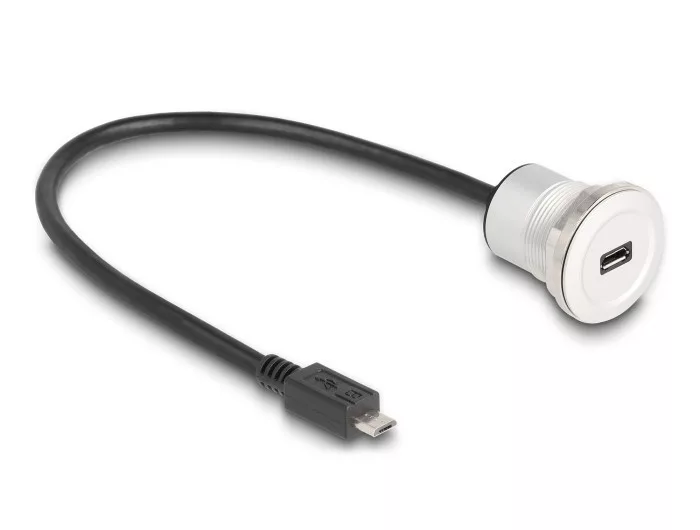 Ez a Delock kábel használható például egy panelbe vagy házba történő illesztéshez, amennyiben megfelelő nyílás elérhető. Továbbá használható különböző USB eszközök kibővítésére és összekapcsolására. Műszaki adatok Csatlakozó: 1 x USB 2.0 Micro-B típusú dugó 1 x USB 2.0 Micro-B típusú hüvely anya installációhoz Menet típus: M22 Beépített nyílás átmérője: 23,7 mm Akár 480 Mbps sebességű adatátvitel Kábel vastagsága: 28 AWG adatvezeték 28 AWG tápvezeték Kábelátmérő: kb. 3,5 mm Szín: fekete / ezüst Hosszúság a csatlakozóval együtt: kb. 30 cm A csomag tartalma USB kábel Csomag Zárható műanyag tasak Gyártó: Delock