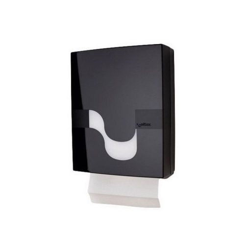 - kéztörlő papír adagoló, papírtörlő tartó- V hajtogatott kéztörlőhöz használható- ABS műanyag- fényes fekete- nagy méretű betekintő ablak- 360 (mag) x 275 (szél) x 125 (mély) mm