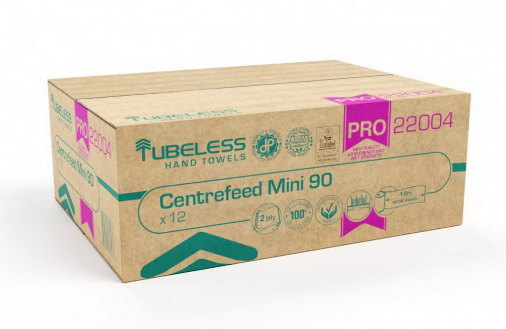 Tubeless PRO 90 Mini tekercses kéztörlő 2 rétegű, fehér, 100% cellulóz, 92m, 12 tekercs/zsugor
