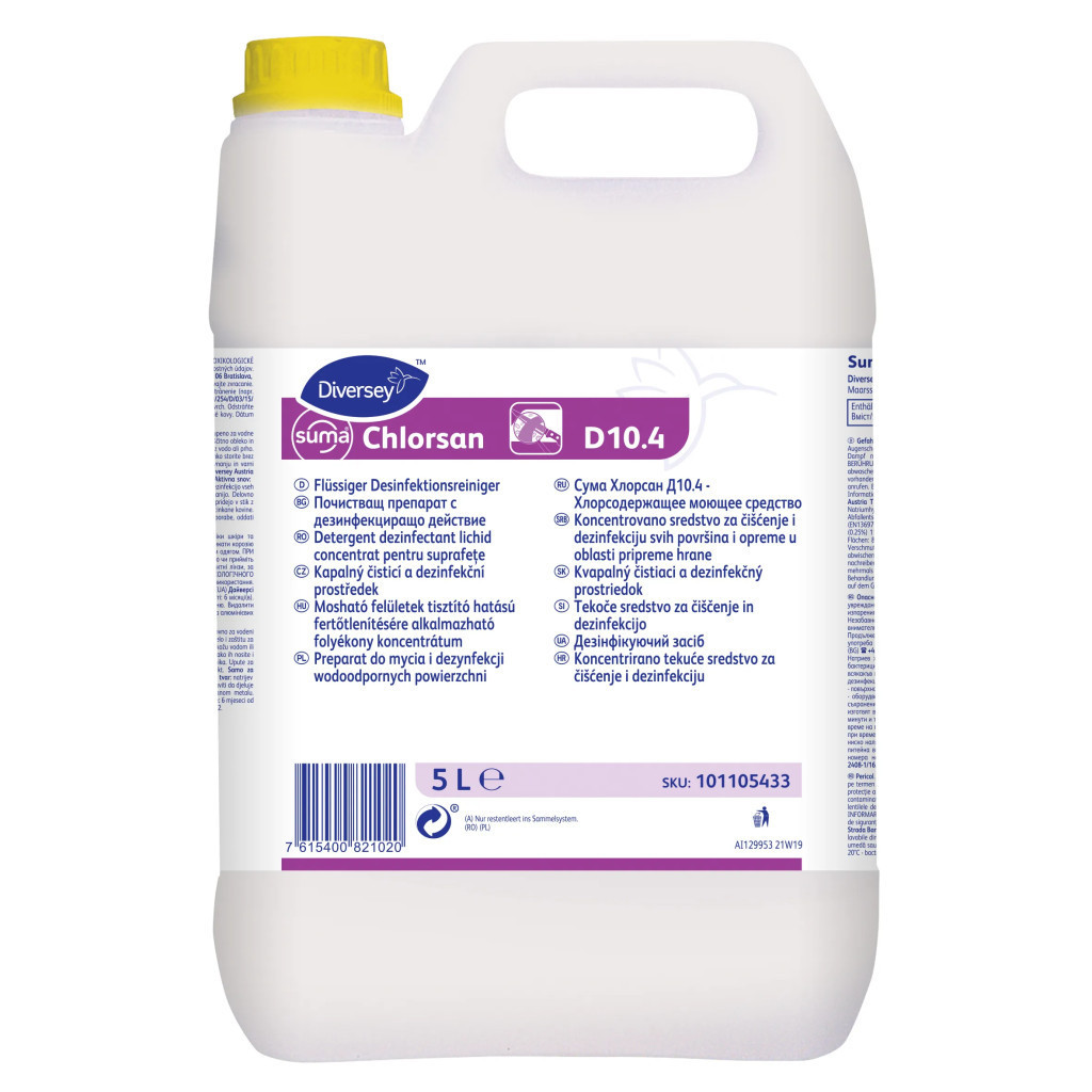 A Suma Chlorsan D10.4 élelmiszerrel érintkező felületek fertőtlenítésére szolgáló, koncentrált tisztítószer.