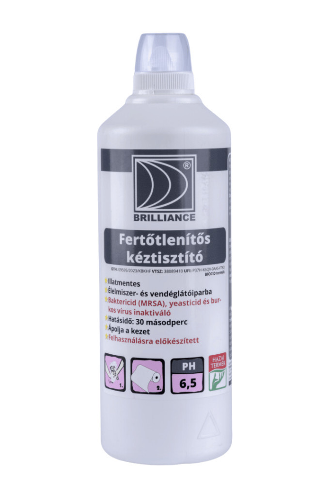 A Brilliance® Fertőtlenítős kéztisztító az élelmiszeriparban használható fertőtlenítő hatással rendelkező folyékony szappan. Zsírvisszatápláló adaléka által nem szárítja a bőrt, ugyanakkor speciális fertőtlenítő összetétele révén sokkal kellemesebb a kézfertőtlenítés művelete, mivel nem tartalmaz alkoholt és hipót. Hatásspektrum: baktericid (MRSA), yeasticid, burkos vírus inaktiváló 30 másodperc alatt.