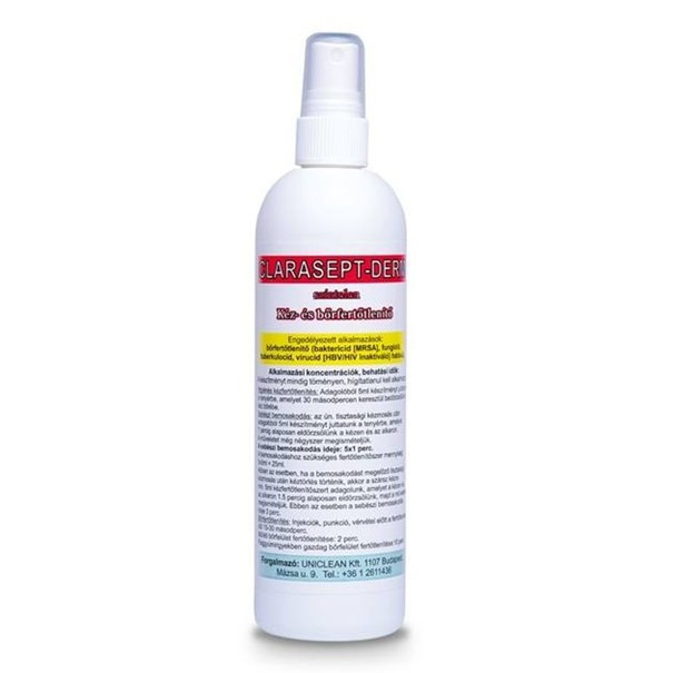 A Claradsept-Derm fertőtlenítőszer alkalmas általános higiénés kézfertőtlenítésre, illetve sebészi bemosakodásra, sebészi kézfertőtlenítésre (bemosakodás). Antimikrobiális spektrum baktericid (MRSA), fungicid, tuberkulocid, virucid (HBV és HIV inaktiváló hatású is.