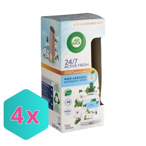 Ismerd meg az Air Wick Active Fresh automata légfrissítőt, a világ első vízbázisú, hajtógázmentes automata készülékét, amely a természet erejével varázsolja otthonodat a frissesség oázisává. A Friss Pamut illat a tiszta, frissen mosott ruha kellemes és megnyugtató aromáját idézi, amely hosszan tartó, kellemes légkört teremt.A termék különlegessége a tudatosan kifejlesztett formulájában rejlik. Természetes illóolajokkal gazdagított, miközben mentes a ftalátoktól, hajtóanyagoktól és felesleges színezékektől. A beépített szagsemlegesítő molekulák hatékonyan leküzdik a kellemetlen szagokat ahelyett, hogy csak elfednék azokat, így valódi tisztaságérzetet biztosítanak a fürdőszobában, nappaliban vagy akár a konyhában is.Főbb jellemzők:Vízbázisú formula: Hajtógázok, ftalátok és színezékek nélkül készült.Természetes illóolajok: Autentikus és kellemes illatélményt nyújt.Szagsemlegesítés: Aktívan megszünteti a nem kívánt szagokat.Hosszan tartó hatás: Akár 70 napon át tartó folyamatos frissességet biztosít a legalacsonyabb beállításon.Környezettudatos csomagolás: A készülék és a flakon is újrahasznosított műanyagból készült.Személyre szabott illatélményAz Air Wick Active Fresh készülékkel teljes mértékben te irányítod az illat intenzitását. Válassz a három illaterősségi fokozat közül, hogy otthonod illata mindig tökéletesen illeszkedjen a hangulatodhoz. Ha pedig azonnali extra frissességre vágysz, csak nyomd meg a készülék tetején található TURBÓ GOMBOT, és élvezd az intenzív illatfelhőt!Használati útmutatóA készülék használata rendkívül egyszerű. Az utántöltő behelyezése előtt mindig kapcsold ki a készüléket. Helyezd be az elemeket és az utántöltőt, majd állítsd be a kívánt illaterősséget. A készüléket mindig az arcodtól elfordítva kapcsold be, és helyezd legalább 2 méter magasságba a padlótól. A biztonságos használat érdekében mindig olvasd el a csomagoláson található részletes útmutatót és figyelmeztetéseket!