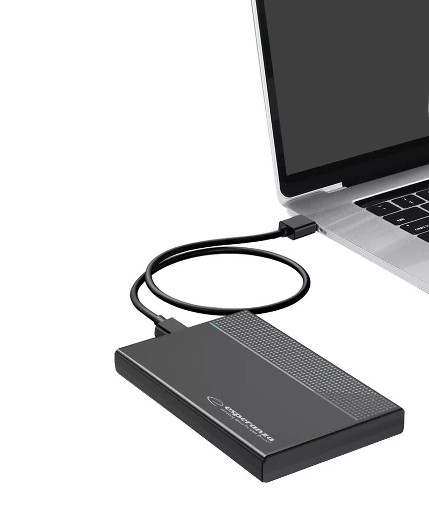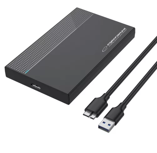 Esperanza external enclosure for SATA 2.5" drives. The enclosure allows data transfer speeds of up to 5 Gbps and is compatible with Windows, Mac OS, and Linux operating systems. It supports direct connection to TVs (if external storage is supported) or can be used as an external drive for PS4 or Xbox consoles (360/Xbox One). Driver-free operation with Plug&Play functionality.
