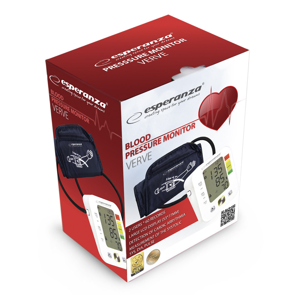 The Esperanza VERVE upper arm blood pressure monitor is a precise and functional device that enables easy monitoring of blood pressure and pulse at home. With modern oscillometric measurement technology, a large LCD display, and an arrhythmia detection function, the device ensures accurate results to help maintain daily health monitoring. It is ideal for individuals who value convenience, accuracy, and the ability to save results for two users.