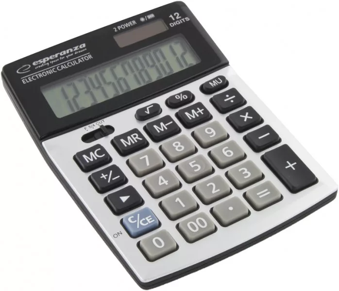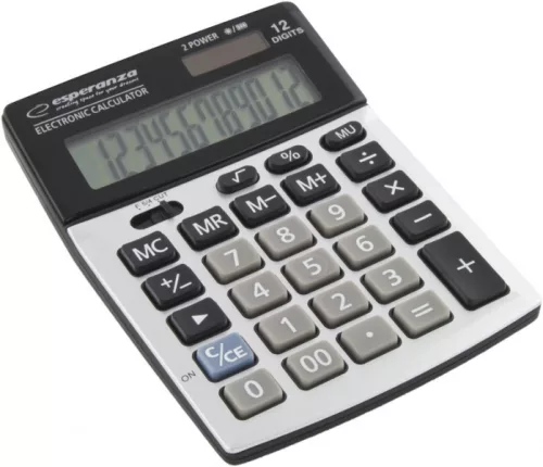 Electronic desktop calculator Esperanza NEWTON with a large 12-digit display. It features all basic mathematical functions, a digit correction function, and the ability to store results. The tilted display, large visible digits, and big keys make it easy and convenient to use. Equipped with built-in solar power, it is ideal for daily use in shops, offices, or at home.