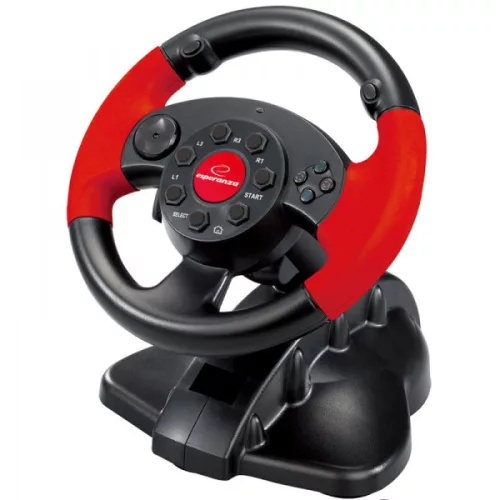 Compact gaming steering wheel Esperanza HIGH OCTANE for PC and consoles PSX, PlayStation 2, and 3. Includes a separate module with gas and brake pedals. Dive into the virtual racing world and feel like a professional rally driver with our high-quality steering wheel.