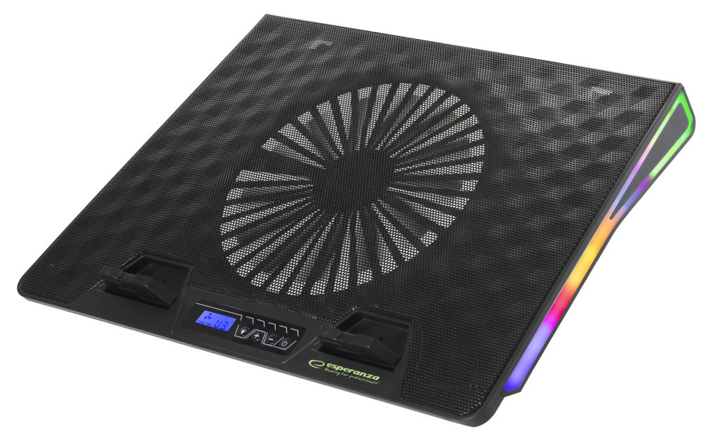 Slim, modern, and stylish, LED RGB illuminated cooling pad for notebooks – Esperanza ALIZE. It features a built-in ultra-quiet fan that effectively dissipates the heat generated beneath the notebook, cooling it down and lowering the temperature of its components, ensuring stable performance and longer battery life. The sturdy, durable construction easily supports the weight of the notebook. It doesn't require external power sources – powered via the notebook’s USB port. No installation required. Durable, convenient, and easy to carry. Compatible with all types of notebooks.