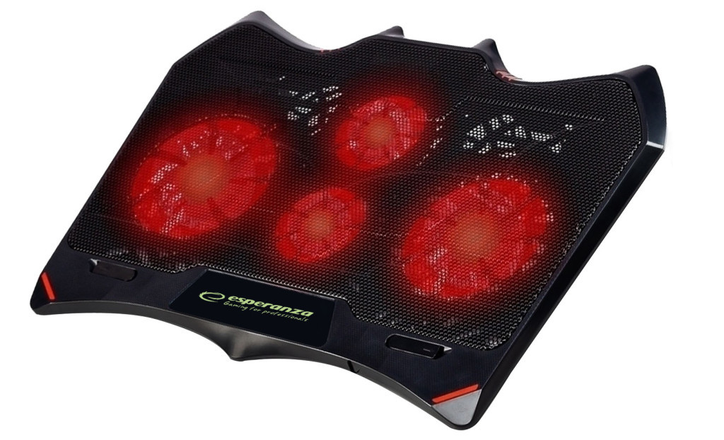 Thin, modern, and stylish LED backlit cooling pad for notebooks - Esperanza BURAN. It features 4 built-in ultra-quiet fans. These remove the heat generated under the notebook, cooling it down and lowering the temperature of its components, ensuring stable performance and extending battery life. The solid, durable construction easily supports the weight of the notebook. No external power sources are needed – it is powered via the notebook’s USB port. No installation required. Durable, convenient, and portable. Compatible with all types of notebooks.