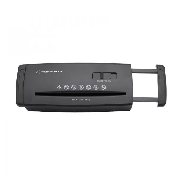 Shredder Esperanza BLADE. It efficiently shreds up to 5 sheets of A4-sized paper (80 g/m²) simultaneously, turning documents into strips approximately 7 mm wide. The device features a safety lock and a thermal cut-off switch.
