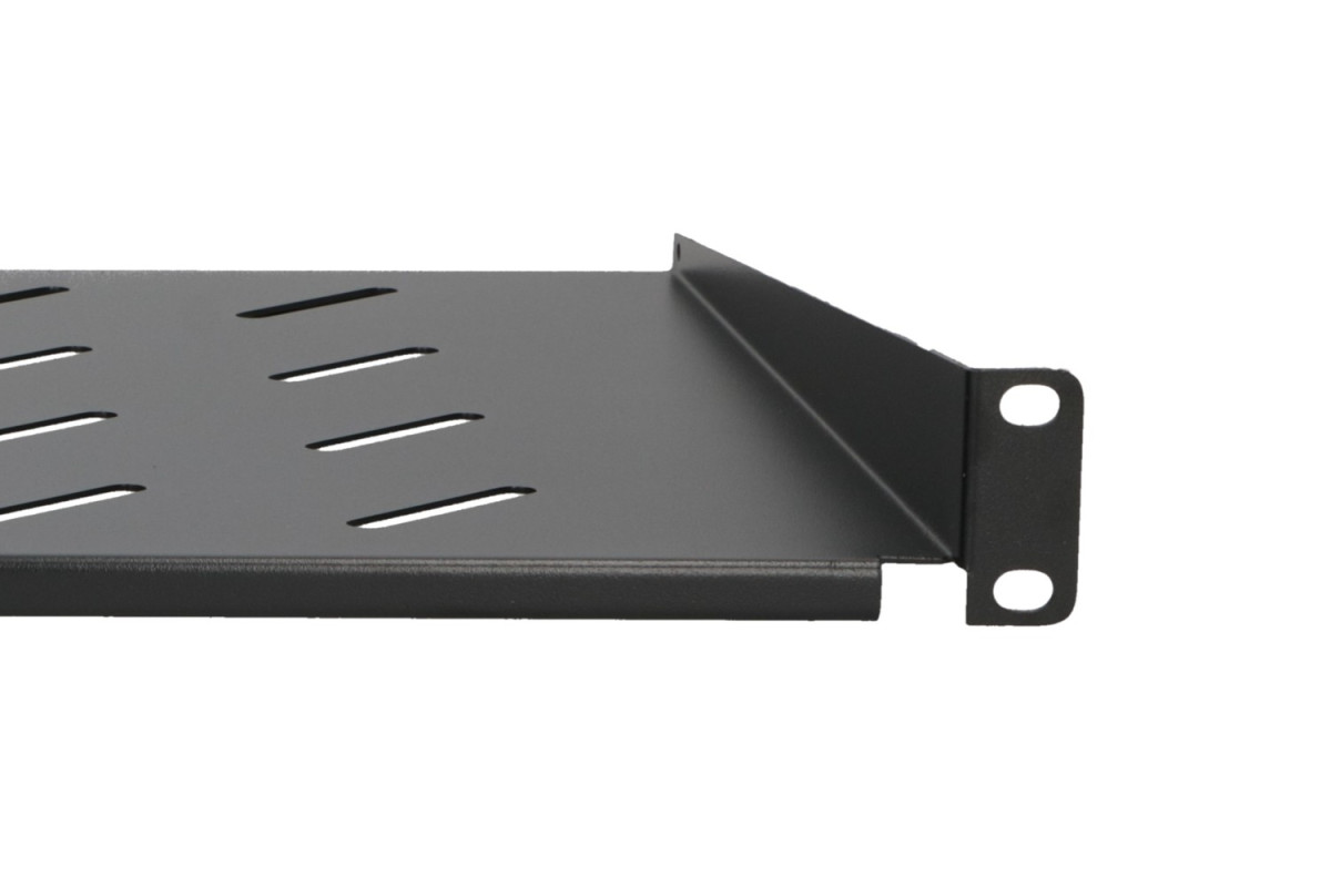 Fixed shelf with a width of 483mm, dedicated for 19'' RACK hanging cabinets. With its help, it is possible to mount devices in the cabinet that do not have RACK 19'' enclosures. Made of steel sheet in black color. The shelf is fixed in 4 points, which guarantees its stability. RACK standard cabinets are widely used in server rooms, recording studios, industrial premises, teletechnology and power engineering.
