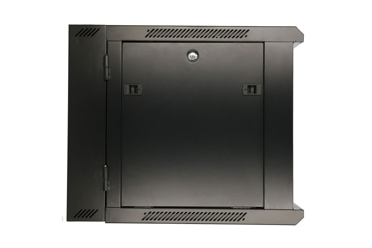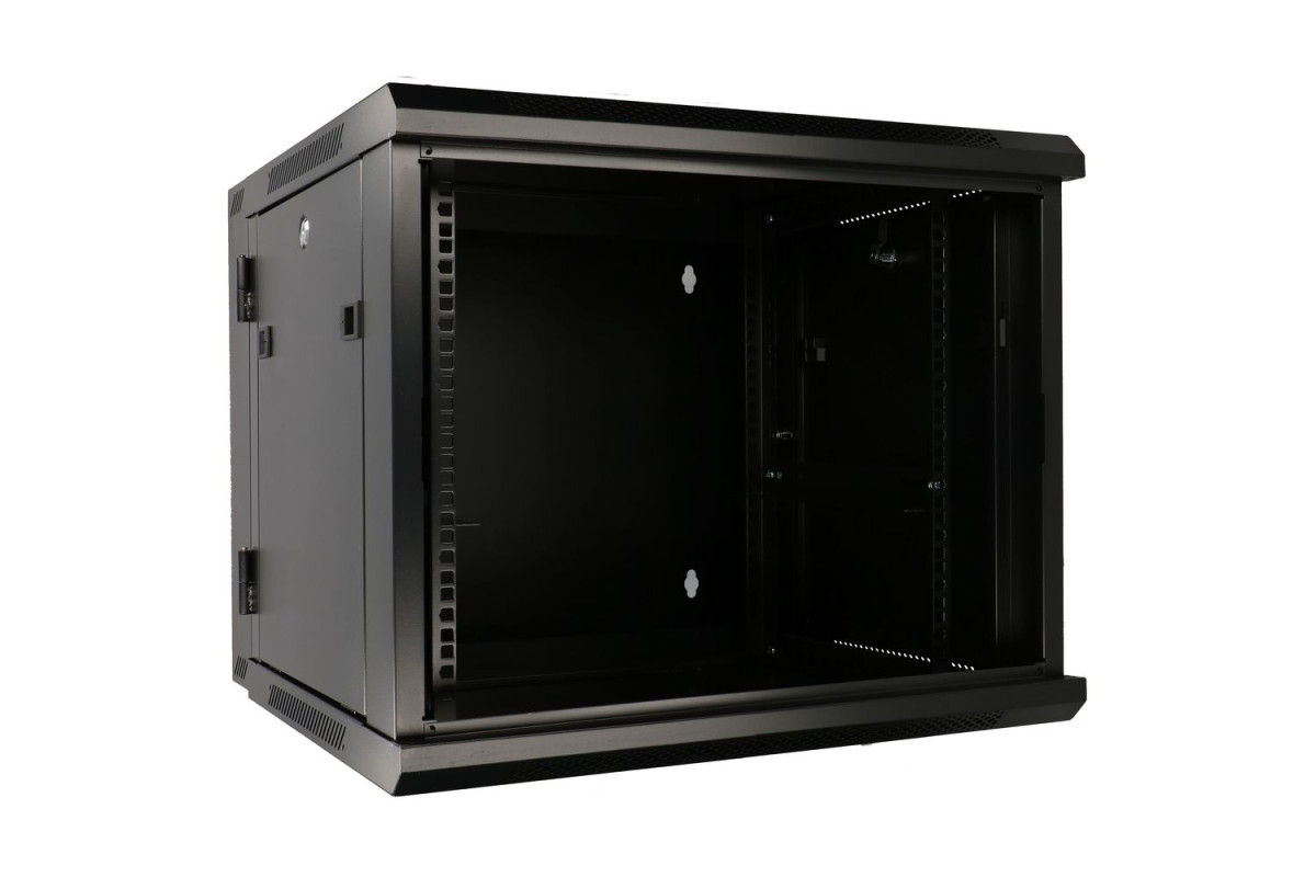 Extralink's rack cabinet is designed for wall mounting in offices, network server rooms and CCTV control rooms. The outer walls are made of cold-rolled steel sheet. Equipped with a pane of tempered glass, the front door can open to the left or right side. The cabinet's two-section design facilitates access from the rear to installed components.