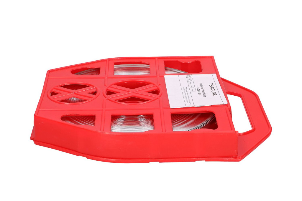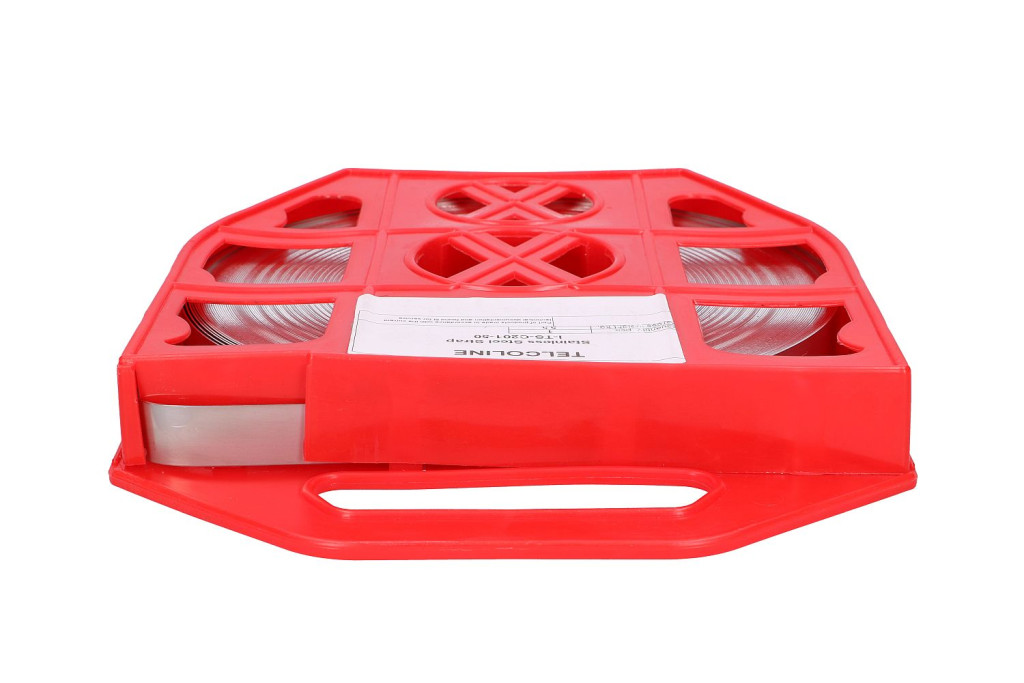Stainless steel tape C201, length 50m, dimensions 10mm x 0.7mm. The tape has a convenient packaging made of impact-resistant plastic. For use, among other things, for ties attaching brackets to poles.