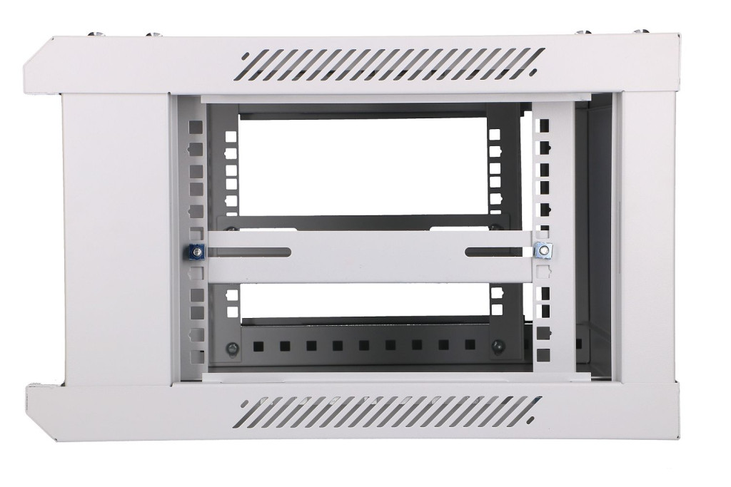 The Extralink rack cabinet is designed for wall mounting in offices, network server rooms and CCTV control rooms. External walls are made of cold-rolled steel sheet, while the front door has a tempered glass pane with the possibility of opening to the left or right side.