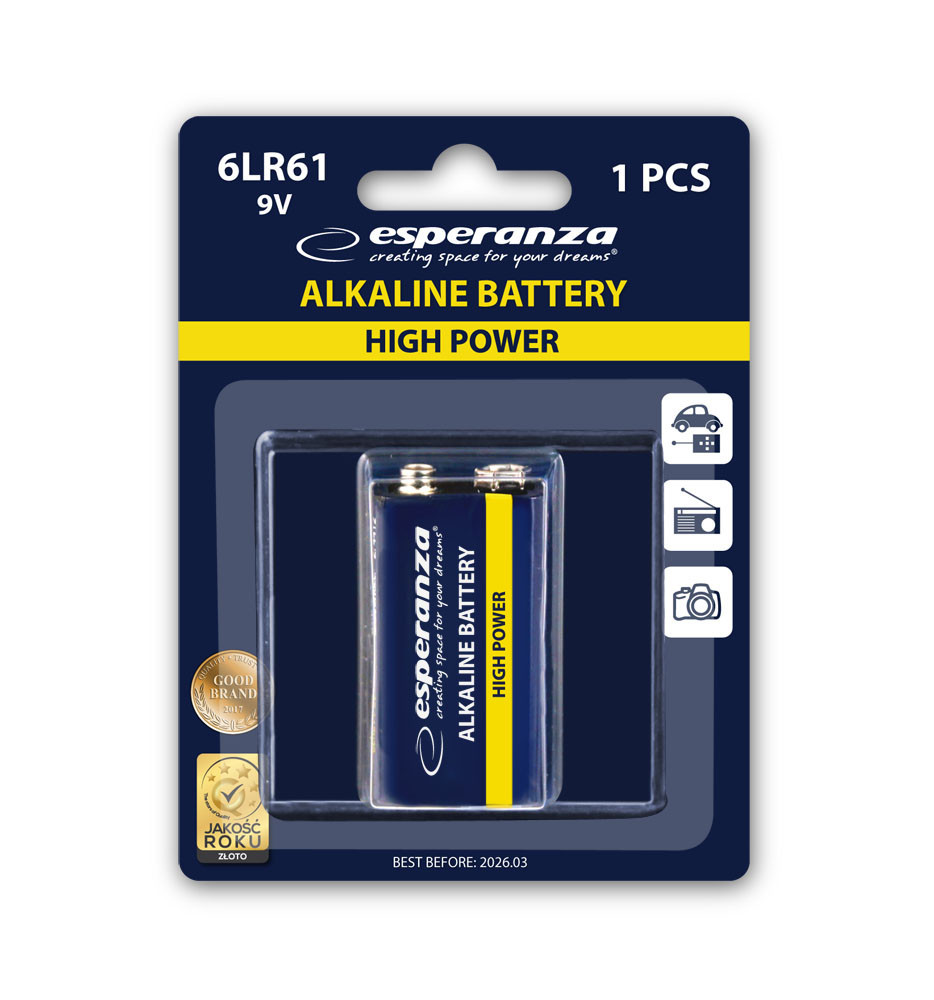 The highest quality Esperanza alkaline batterry 6LR61 (9V / 6F22 / 6LF22). Intended for everyday use in devices with high and medium power consumption. Perfect for flashlights, radio, electronic toys, portable electronic equipment, etc. Alkaline batteries have a longer life compared to regular carbon-zinc batteries. Our batteries are mercury and cadmium free.