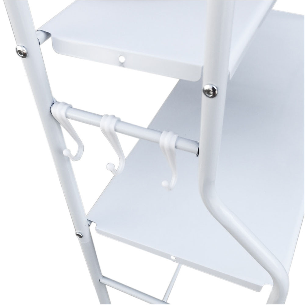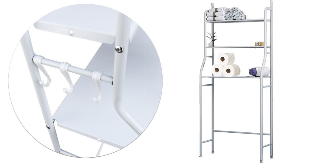 A tároló állvány három akasztó kampót is tartalmaz, amelyeket szabadon helyezhetsz el az igényeid szerint. Ezek kiválóan alkalmasak kisebb tárgyak, például fürdőszobai eszközök vagy törölközők tárolására, hogy mindig kéznél legyenek.