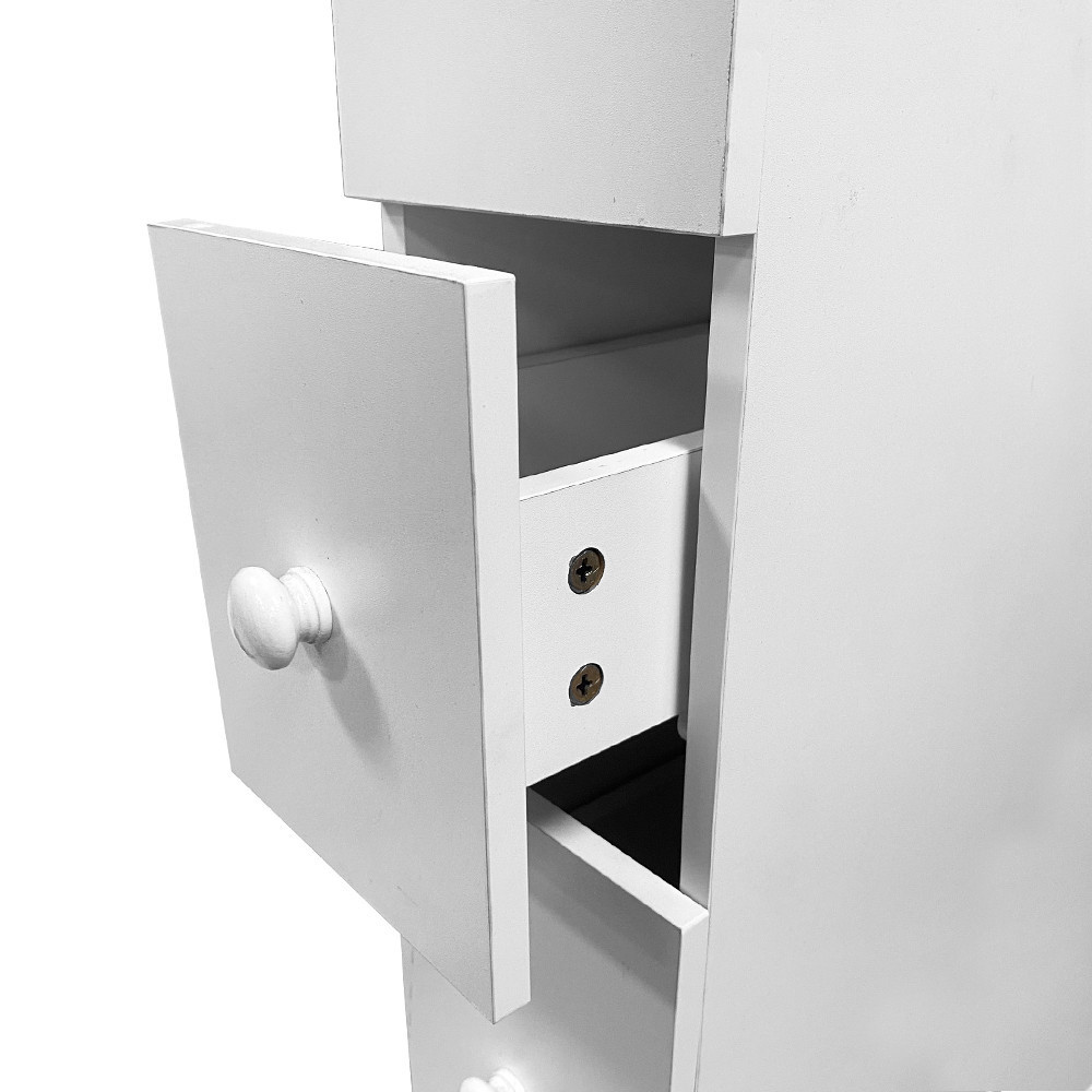 A szekrény keskeny és helytakarékos kialakítású, mindössze 15,5 cm széles, így szűk helyekre is beilleszthető, ahol más bútorok nem férnének el. Két tágas fiókjában könnyedén elrejtheted a holmijaidat, míg a tetején és a polcán további tárolási lehetőségeket kínál.