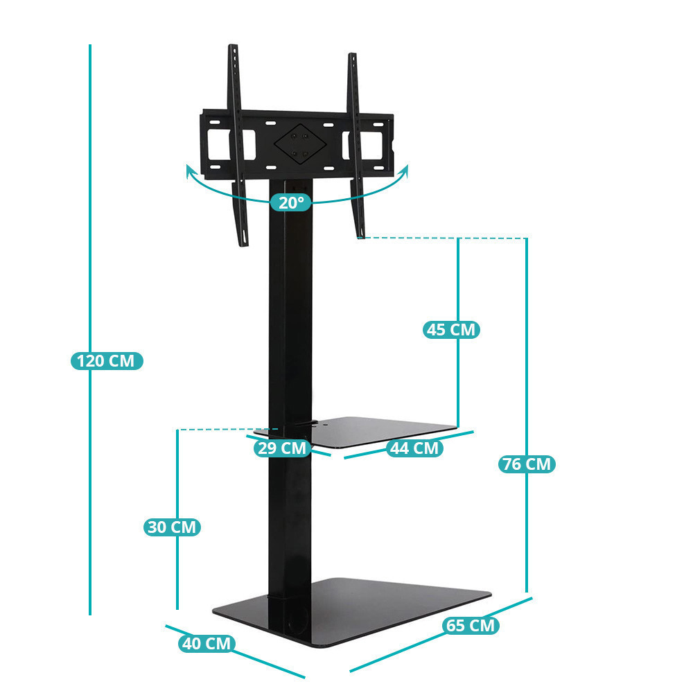 Az álló TV állvány stílusos és praktikus megoldást kínál televíziója elhelyezéséhez, anélkül, hogy falat kellene fúrni. A 40 kg-os teherbírású állvány 65”-os tévékhez ideális, és három magassági szintre állítható a kényelmes nézés érdekében. Az üvegpolc tárolási lehetőséget nyújt, míg a beépített kábelrendező rendszer gondoskodik az esztétikus megjelenésről.