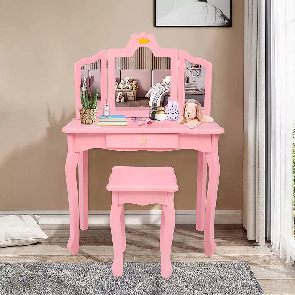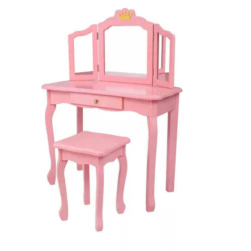 Ez a klasszikus dizájnú, festett fa fésülködő asztal tökéletes játék minden kislány számára, aki hercegnőnek szeretné érezni magát. Behajtható tükrökkel, arany koronával és saját kis székkel felszerelve igazi álombútordarab, mely órákra leköti a gyerekeket szépítkezés és szerepjáték közben.