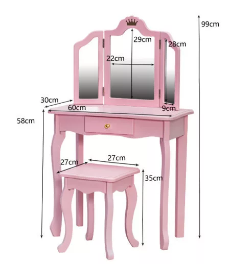 Az asztal és a hozzá tartozó szék méretezése gyerekekhez igazított, így a kicsik kényelmesen ülhetnek le elé, hogy elmerüljenek a napi „szépítkezésben”. A három részből álló tükör szárnyai könnyen behajthatók, így biztonságos és praktikus is.