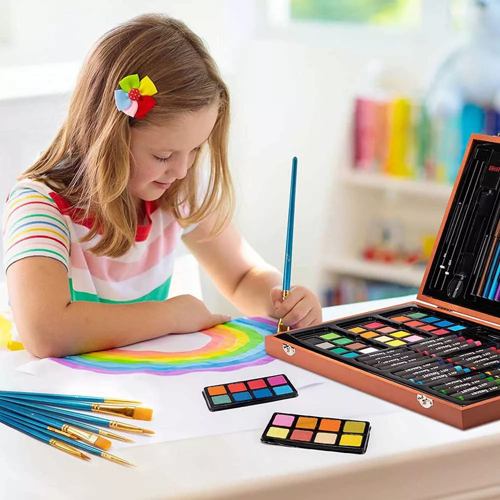 A készlet prémium minőségű fa és műanyag anyagokból készült, biztosítva az eszközök hosszú élettartamát. A rendezett elrendezésű rekeszeknek köszönhetően a művészkellékek mindig kéznél vannak, és könnyen rendben tarthatók.