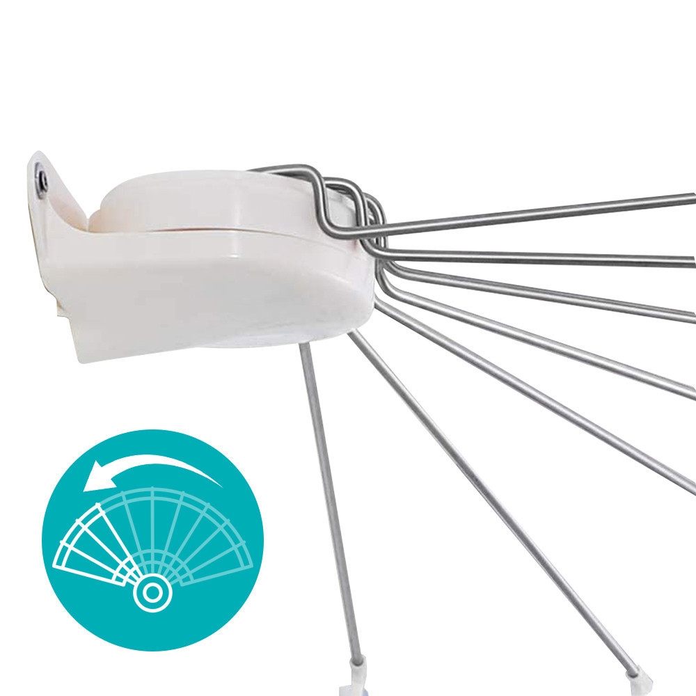 Az ernyő alakú kialakítás különösen előnyös kis méretű fürdőszobákban. Használaton kívül a tartó könnyedén oldalra fordítható, így helyet spórolsz, amikor épp nincs rá szükség.