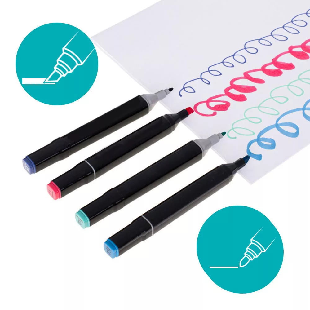 A markerek két különböző hegyszélességgel rendelkeznek. A vastagabb vég, amely maximum 5 mm-es vonalvastagságot biztosít, ideális nagyobb felületek kitöltéséhez, színezéshez és árnyékoláshoz. A vékonyabb vég, amely maximum 1 mm-es vonalat eredményez, tökéletes kontúrozáshoz és finom részletek kidolgozásához. A markerek gyorsan száradó tintája megakadályozza az elkenődést, de lehetővé teszi a színek egyszerű keverését, hogy még egyedibb árnyalatokat hozhass létre.