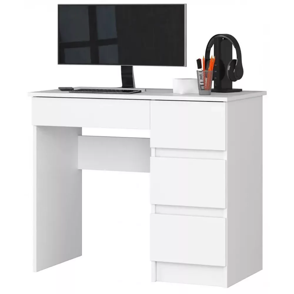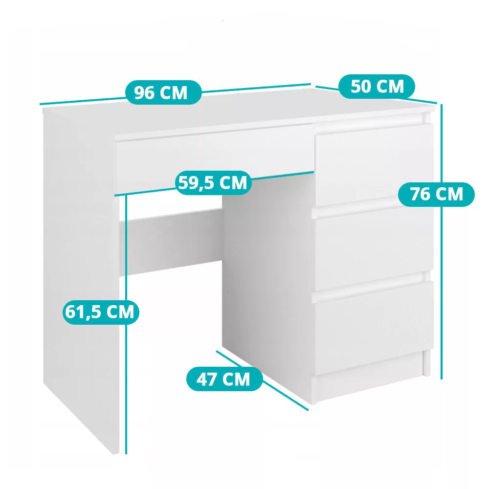 Az asztal összesen négy fiókkal rendelkezik, így minden munkaeszköz és dokumentum rendszerezetten elhelyezhető benne. Az asztallap alatti nagyobb fiók ideális a rendszeresen használt tárgyak számára, míg az oldalsó tárolók tökéletesek iratok, füzetek vagy irodai kiegészítők tárolására. Az alsó polc további lehetőséget kínál a rendszerezésre.