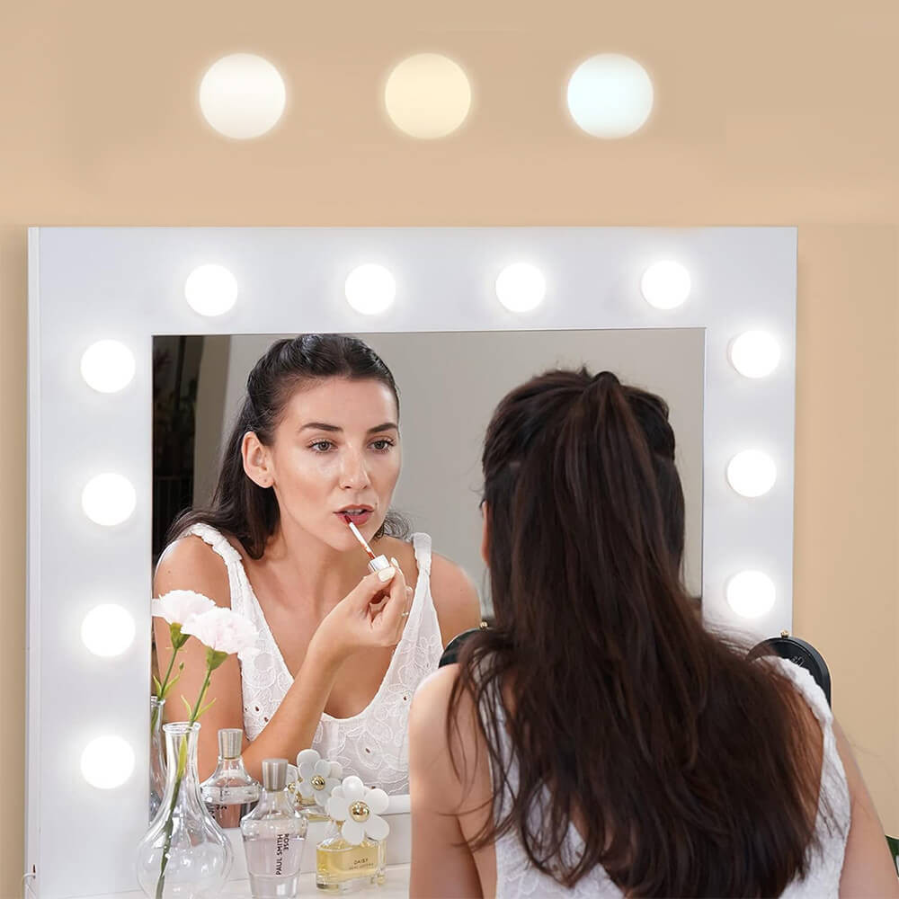A LED világítással ellátott tükör és a modern, matt felületű fésülködőasztal tökéletes hangulatot teremt a reggeli készülődéshez. A világítás fényereje állítható, így mindig az adott környezethez igazítható.