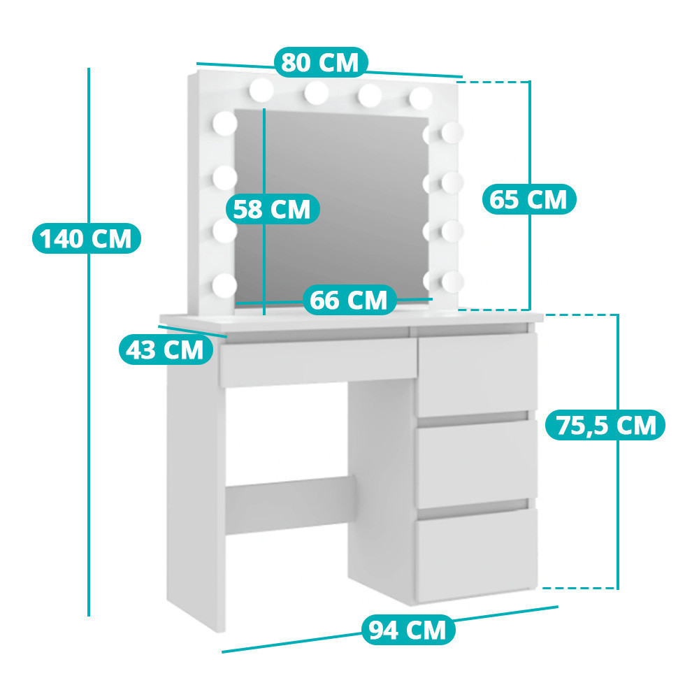 A 94 cm széles asztal megfelelő munkafelületet nyújt, a 140 cm-es teljes magasság pedig kényelmes tükröződést biztosít. A tükrös rész széles látószöget kínál, így minden részletre figyelhetsz.