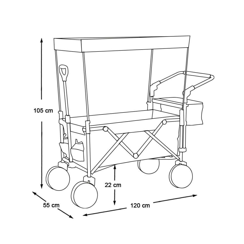 Az összecsukható, tetővel ellátott kézikocsi ideális társ kerti munkákhoz, kirándulásokhoz, strandoláshoz vagy akár horgászathoz. Erős, 100 kg teherbírású kialakításának és kényelmes hordozhatóságának köszönhetően szinte bármilyen feladatra alkalmas. Levehető tetője és tárolózsebei még praktikusabbá teszik, a masszív váz pedig egyszerűen összecsukható, így kis helyen is elfér.