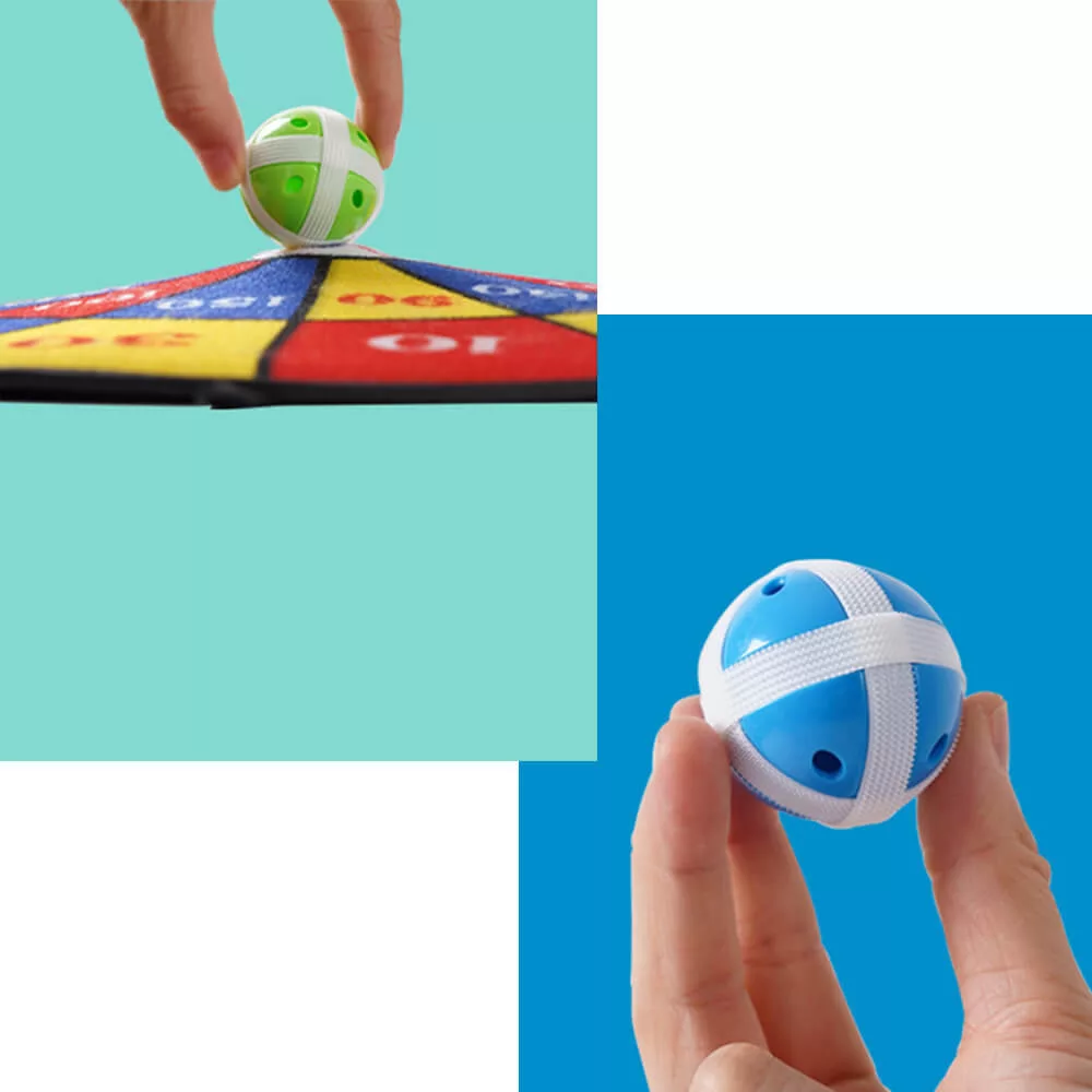 A hagyományos darts nyilakkal ellentétben ennél a játéknál öntapadós labdák tapadnak a tábla felületére, így nem kell aggódnod a sérülések miatt. Kifejezetten kisgyermekek számára is ideális, hiszen veszélytelen, mégis ugyanolyan izgalmas, mint az eredeti játék.