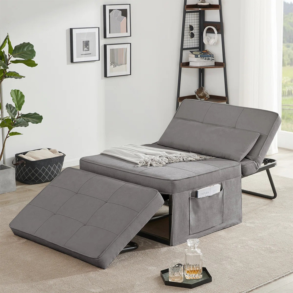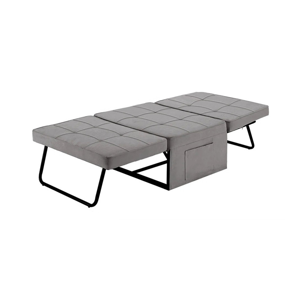 Összecsukva kompakt fotelként használható (77×70×40 cm), kinyitva pedig 80×190 cm-es fekvőfelületet kínál. A praktikus oldalzsebben újságot, távirányítót vagy telefont is tárolhatsz.