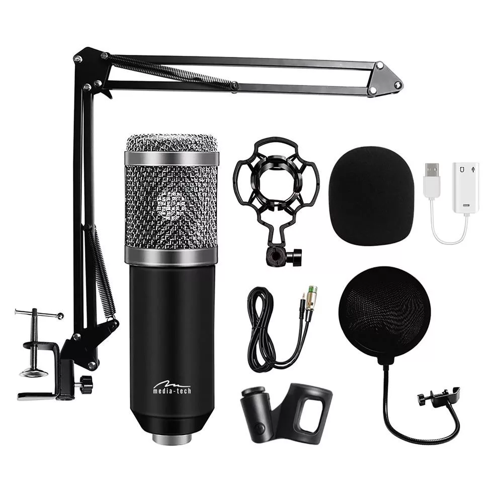 Professzionális mikrofonkészlet streameléshez és stúdiófelvételhezKondenzátor mikrofon technológiaÁtviteli frekvencia: 20-20000 HzÉrzékenység: -32 dB +/- 1 dB (0 dB = 1 V / Pa @ 1 kHz)Impedancia: 150? 30%Alumínium házSzivacs bevonatÖsszecsukható fém állvány tartóval az asztal széléreRezgéscsillapító kosárPop szűrő a rugalmas karonProfesszionális XLR 240cm XLR kábel dugóval 3,5mm minijackUSB hangkártya mellékelve (kompatibilis a Windows 8/10 32/64 bites rendszerrel)Mikrofon méretei: 160 x 46 mmMikrofon súlya: 179 g