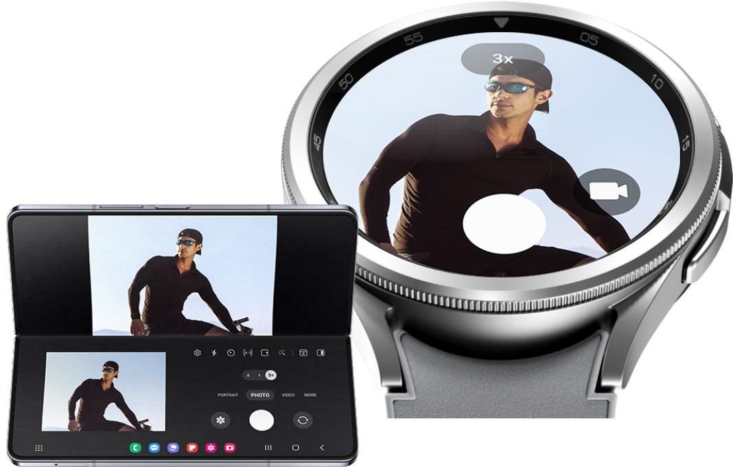 Készíts magadról képet akció közbenNyisd meg a fényképezés új dimenzióját, ha órádat összekapcsolod a Galaxy Z Fold5 és más Galaxy okostelefonokkal! Flex üzemmódban még szebb felvételeket készíthetsz a távkioldó funkcióval, amellyel tökéletesen összehangolt fényképeket és videókat örökíthetsz meg a csuklód egyetlen érintésével. A telefon nagyobb kijelzőjén viszont élvezni fogod az órádról gyűjtött pontos egészségügyi információkat.