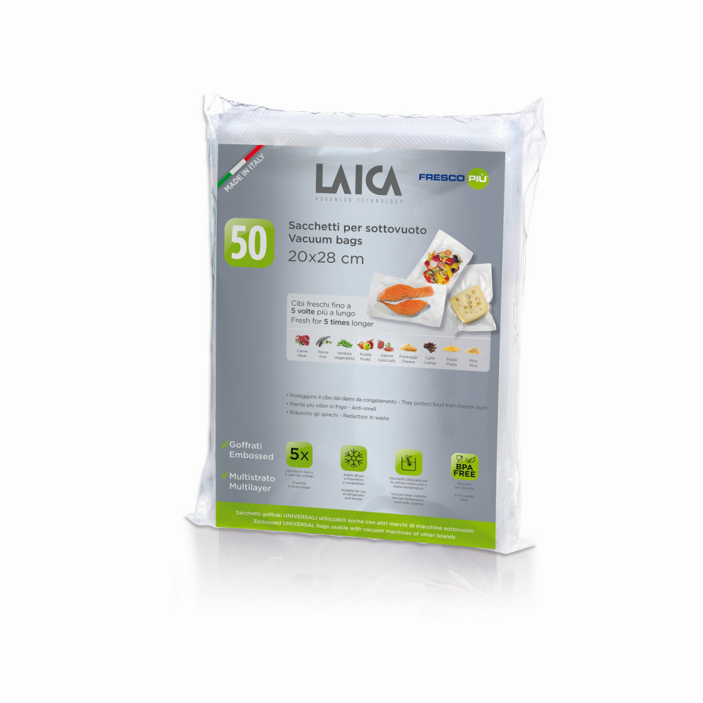 A LAICA légcsatornás vákuumcsomagoló tasak/tömlő kifejezetten élelmiszerek vákuumcsomagolásához lett gyártva Belső rétege antibakteriális és bordázott (légcsatornás) Belső felületének köszönhetően meggátolja az élelmiszerek elmozdulását a vákuum képződése során A légcsatorna garantálja a tökéletes levegő elszívást, ez által a levegőmentes környezetet A külső rétege ellenáll a víznek, gőznek és bizonyos mértékig a magas hőnek Független szakértők vizsgálatai igazolják, hogy minden LAICA tasak Biszfenol A (BPA), ólom, polietilén és ftalát mentes! Alkalmas miden típusú külső vákuumos fóliahegesztő géphez, illetve sous vide főzéshez (70 C fokon max. 6 óra, 100 C fokon max. 15 perces főzésre) Európai gyártású, garantáltan nem oldódik ki semmilyen egészségre ártalmas anyag, megfelelnek az EU 2002/72/EC irányelvének